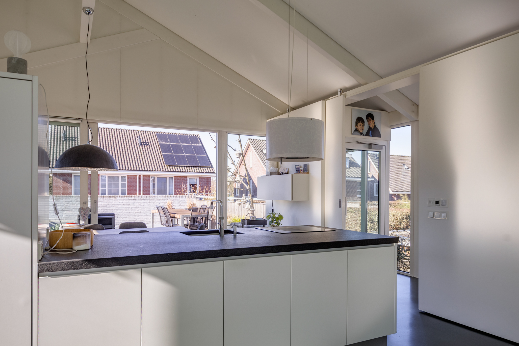 De woning wordt gekenmerkt door indrukwekkende zichtlijnen en een overvloed aan daglicht. De verhoogde woonverdieping fungeert als het hart van het huis, waar wonen en koken samenkomen in een open maar doordachte plattegrond.