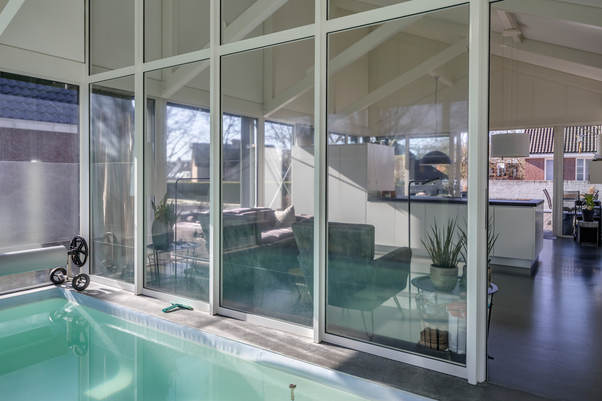 De ruimte wordt gekenmerkt door een indrukwekkende plafondhoogte met zichtbare kapconstructie en rondom glaspartijen die zorgen voor een ongekende lichtinval. Binnen en buiten vloeien naadloos in elkaar over. Aansluitend bevindt zich de woonkamer, eveneens omgeven door glas en met uitzicht op het zwembadgedeelte. De strakke gietvloer loopt drempelloos door en versterkt de rustige, hoogwaardige uitstraling. Tevens bevindt zich hier een 4e toiletruimte. Vanuit de leefruimte bereikt u het riante dakterras, een volwaardige buitenkamer met ruimte voor een grote eettafel en loungegedeelte. Hier geniet u in alle privacy van zon en buitenleven.